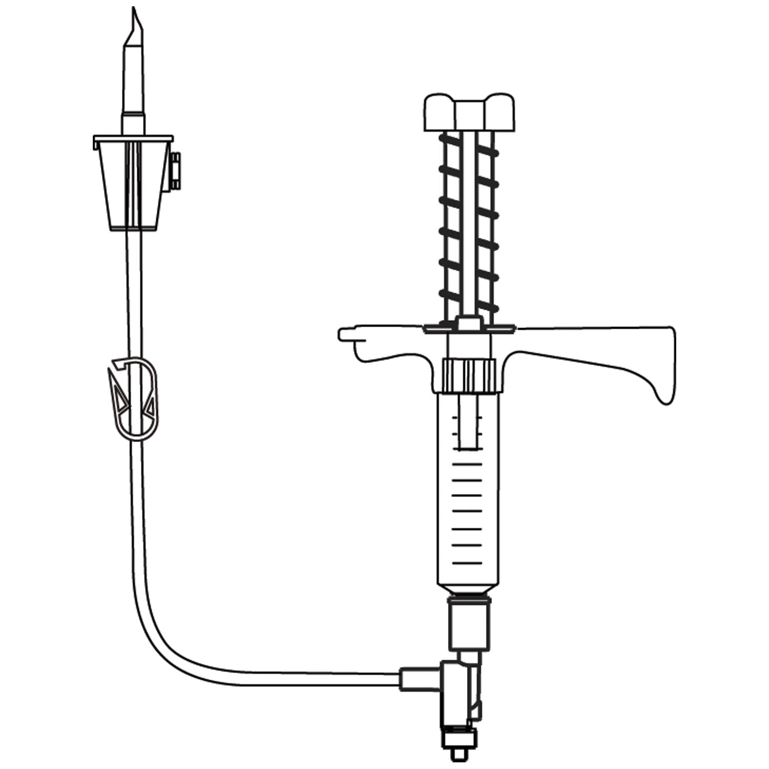 Fluid Dispensing System, Hand-Held Style, 10cc Luer Lock Syringe, Automatic Spring Return, 2-Way Valve, Syringe Volume Adjusting Device Located Below Handle & 41" Vented Transfer Set, For Reconstitution & Dispensing IV Additives & Unit Dose Fluids, DEHP &