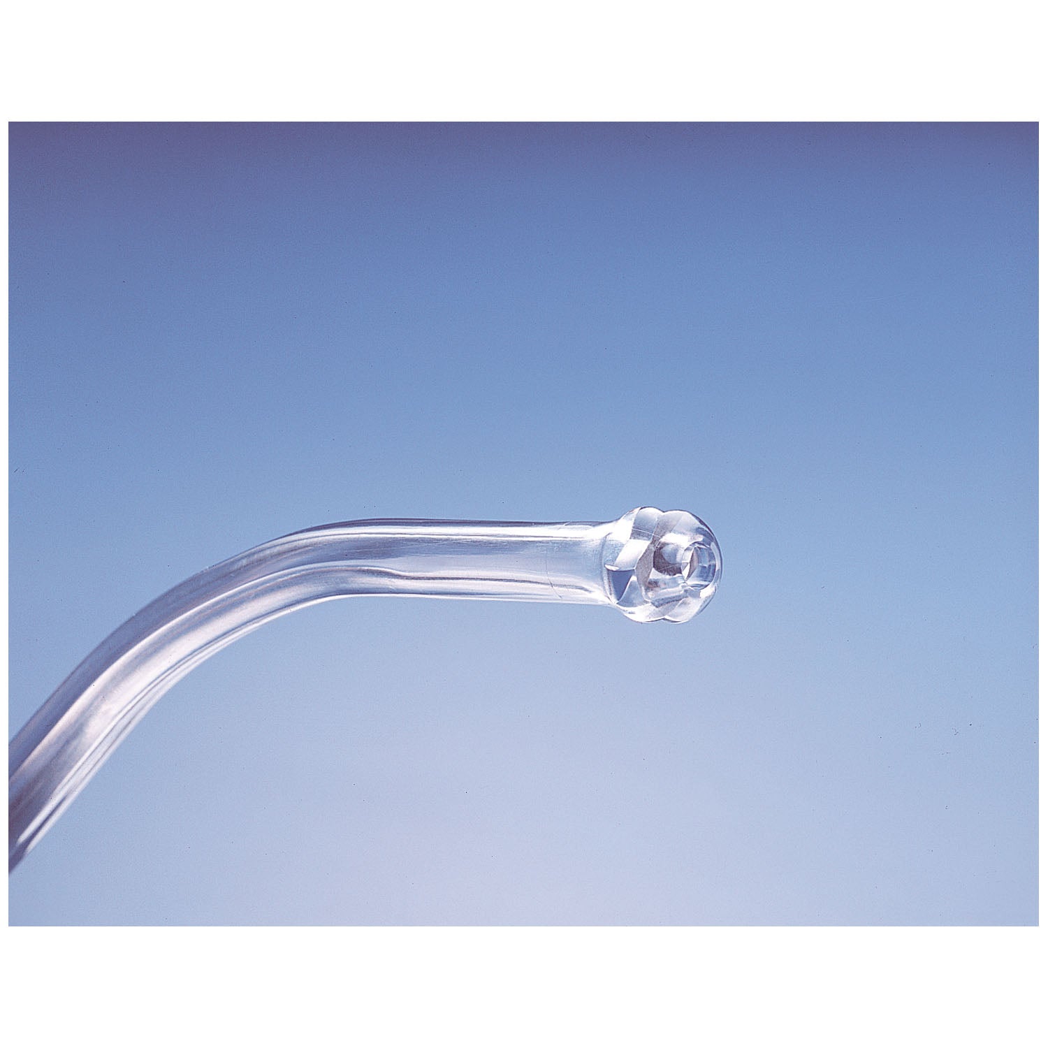 Sterile. Rigid, curved, one-piece design made from clear (blue tint), shatterproof acrylic. Smooth, clean edges; no flash or parting lines. Clear (blue tint) tips permit visual monitoring of suction fluids. Ribbed, universal connector fits securely on all types of tubing. Bulb or open tip. Latex free.