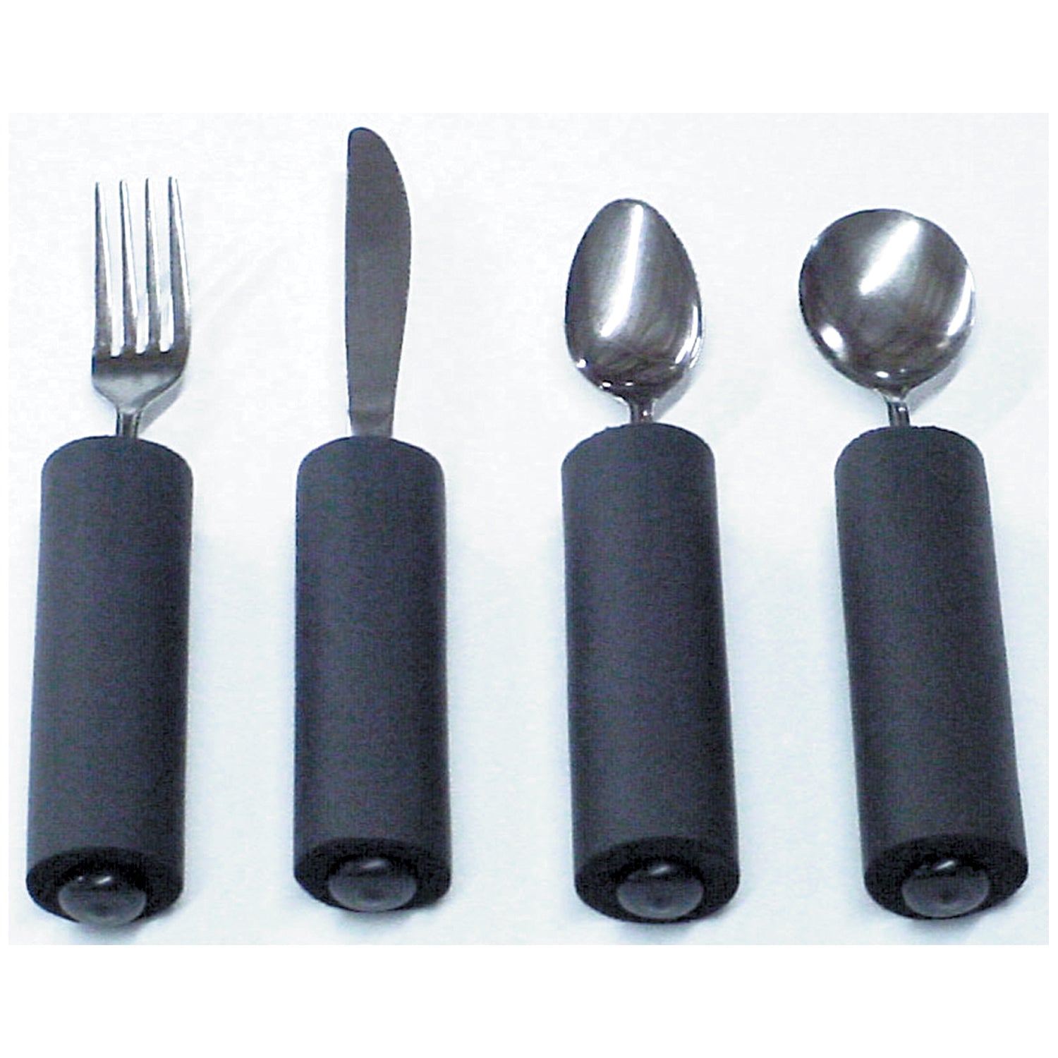 Provides easy grasp for those with arthritis or limited hand involvement. Foam handle may be removed when grasp improves. Plastic inner handle is approximately 5/8" diameter. Overall diameter is approximately 1½". Stainless steel.
